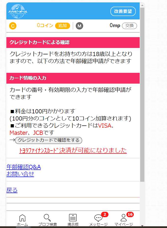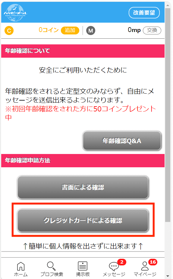 掲示板への書き込みをするのにも年齢確認が必要です。掲示板は気軽にお相手を募集することができる出会うために重宝する機能なので、使えないと結構痛いです。掲示板が使えないとハッピーメールの良さを3割減します。