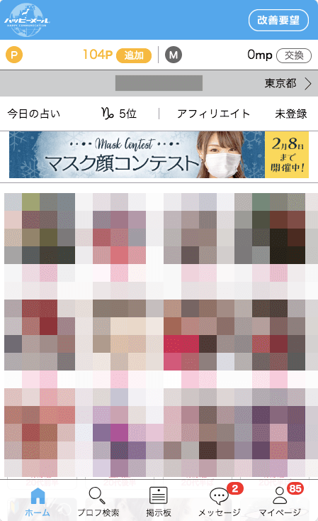 まずWeb版同様にハッピーメールのアプリを開いたら、マイページに移動します。