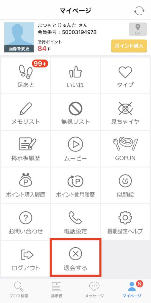 ①アプリを開いて、マイページへ移動。画面真ん中下にある『退会する』をタップ