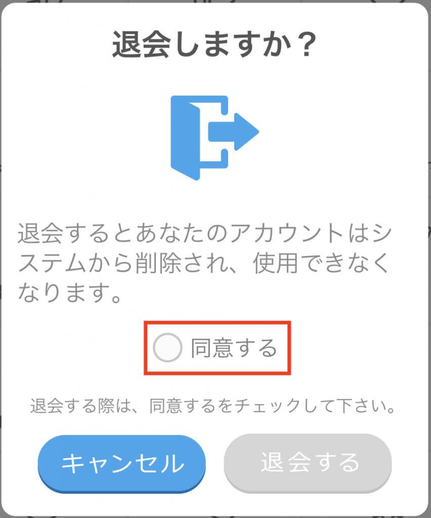 ②注意事項を読んで『同意する』にチェックをいれて『退会する』をタップ