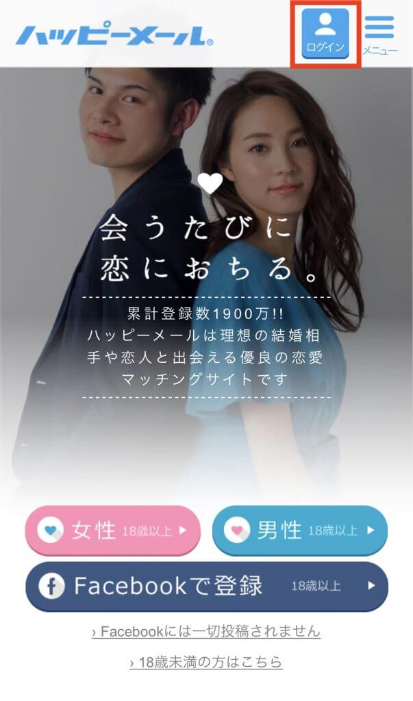 ①ハッピーメールWebサイトにアクセスします。画面右上にある『ログイン』を押します。