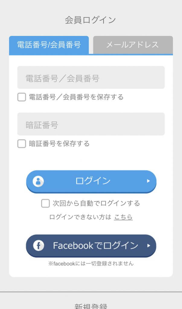 ②ログイン画面で前回登録した電話番号と暗証番号を入力してログインを押す。Facebookで登録していた場合はFacebookログインで再登録できます。