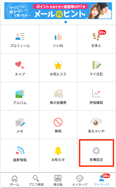 ①『マイページ』に移動して、下にスクロール。左下にある『各種設定』をタップ。