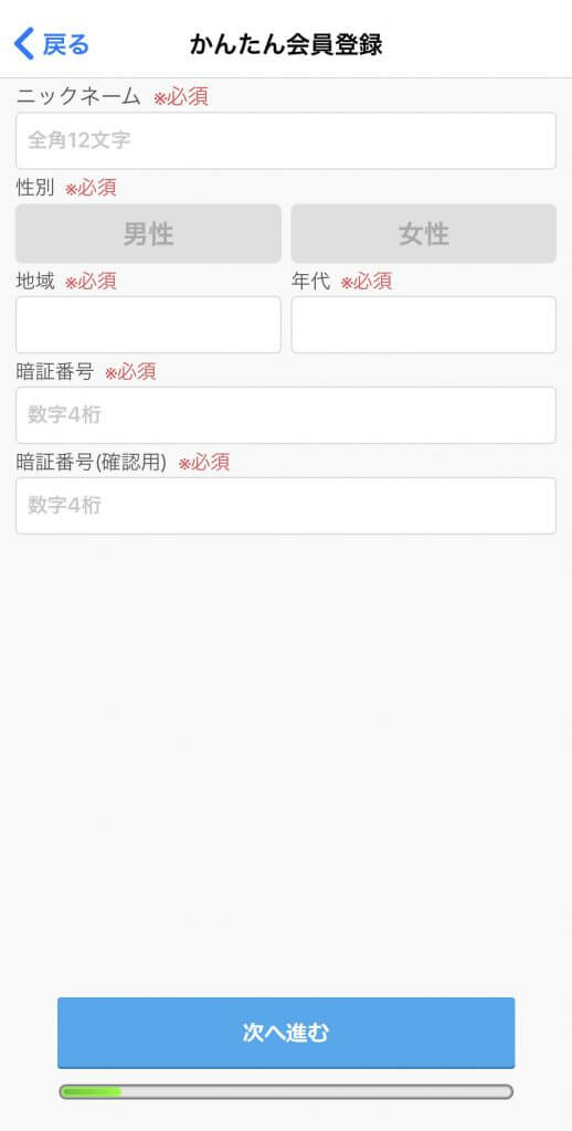 ②名前と性別、地域、暗証番号を入力して次へ進むを押すと会員登録完了です。