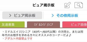 【ピュア掲示板】【その他掲示板】の2種類あり、後者の方はアダルト要素が強い掲示板なので目的によって使い分けるとお目当ての相手と効率よく出会える事ができます。