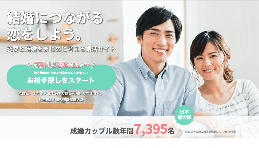 2017年の成婚率が7,395人という日本最大級の実績を持つ婚活サイトです。