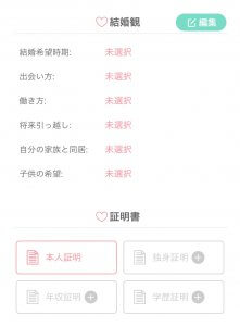 プロフィール項目は基本情報と結婚観・証明書の項目があります。
