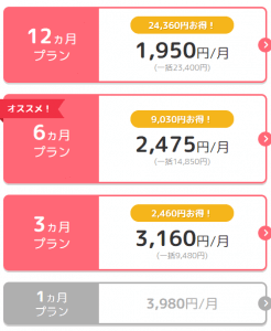 登録について説明したときにも簡単に説明しましたが、プランは1か月・3か月・6か月・12ヶ月の4つのプランがあります。