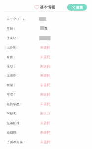 プロフィール項目は基本情報と結婚観・証明書の項目があります。
