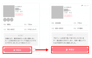 お相手が「申受け」をしてくれたらマッチング完了、メッセージのやり取りができるようになります。