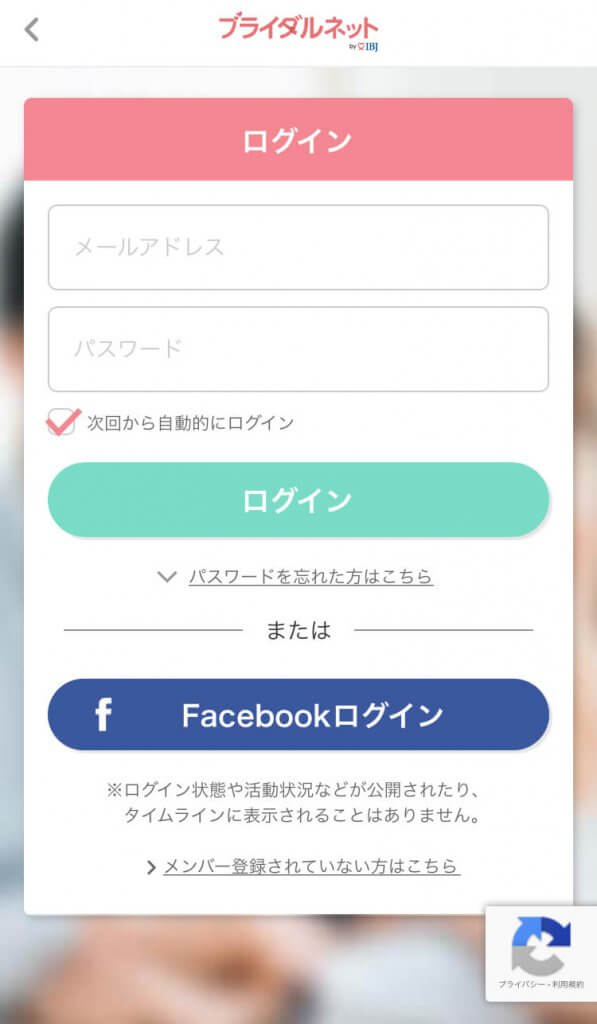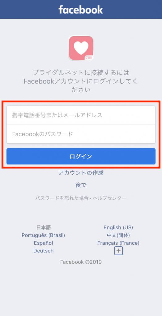 ブライダルネットにログインしようとすると、Facebookログインという項目が出てきます。ログインのたびにIDとパスワードを入力するより、Facebook認証を完了させてFacebookログインできた方が手間が省けますよね。