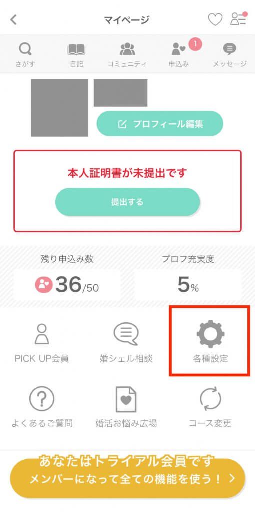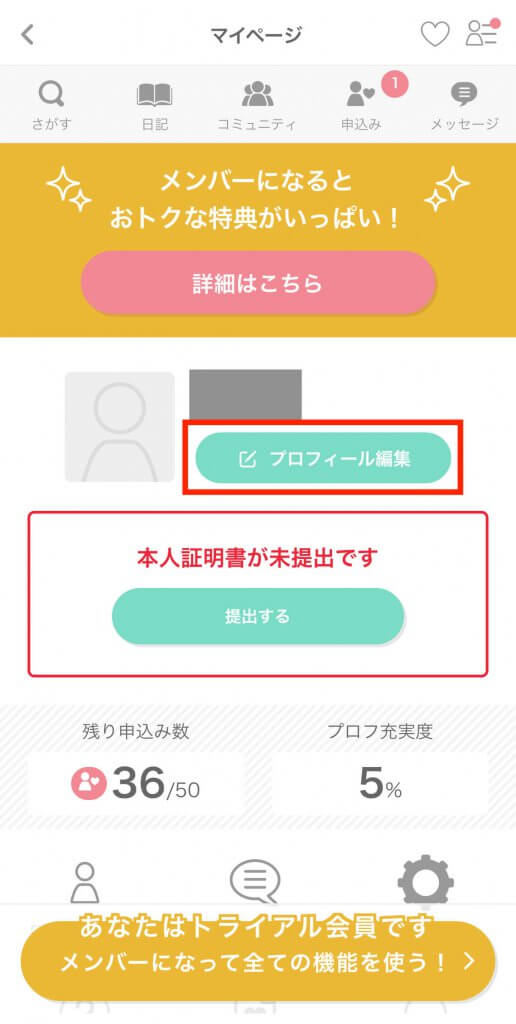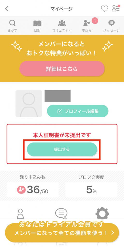 マイページの本人証明証が未提出ですの下にある『提出する』をタップ。公的文書を提出して本人証明を済ませましょう。