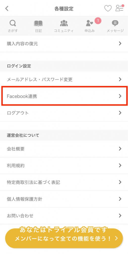 しかし普通にブライダルネットに登録しただけではFacebookでログインすることはできません。登録後に手動でFacebookとの連携が必要なのです。Facebook連携は以下の手順でおこなってください。