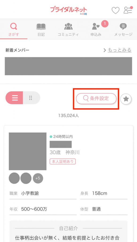 条件設定で自分が理想とする人を絞り込みましょう。年齢や身長・体型はもちろん、お酒やタバコ、最終学歴でも絞り込むことができます。理想の相手が見つかるまでとことん絞り込みましょう。あまりにも絞り込みすぎると該当者がいなくなってしまう可能性があるのでそこだけ注意しましょう。