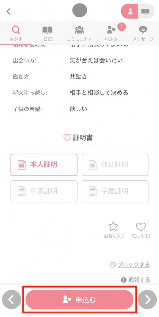 気になるお相手が見つかったら画面の下にある『申込む』からお相手にアプローチしてみましょう。申し込みを受けるとマッチング成立となりメッセージのやりとりができるようになります。