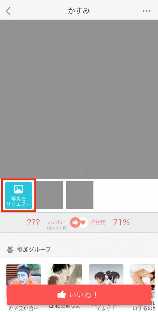 ①写真を見たい相手のプロフィールを開いて、写真をリクエストをタップ