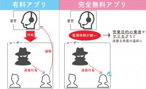 完全無料のマッチングアプリは、出会うまで完全無料です。しかしその代償として、アプリの作りは簡素で、監視体制などにお金をかけられないため業者が多い状態です。
