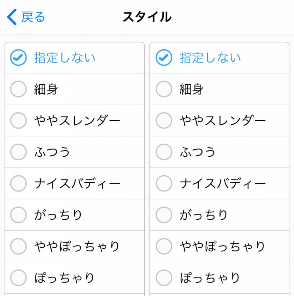 ▼実際のハッピーメールでのスタイル絞り込み画面