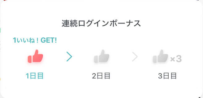1日目と2日目で1いいね、3日目で3いいねの3日間で5いいねを付与されます。ログインボーナスをうまく使うと追加でいいねを購入することなくお相手とマッチングできます。