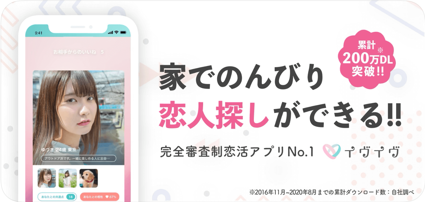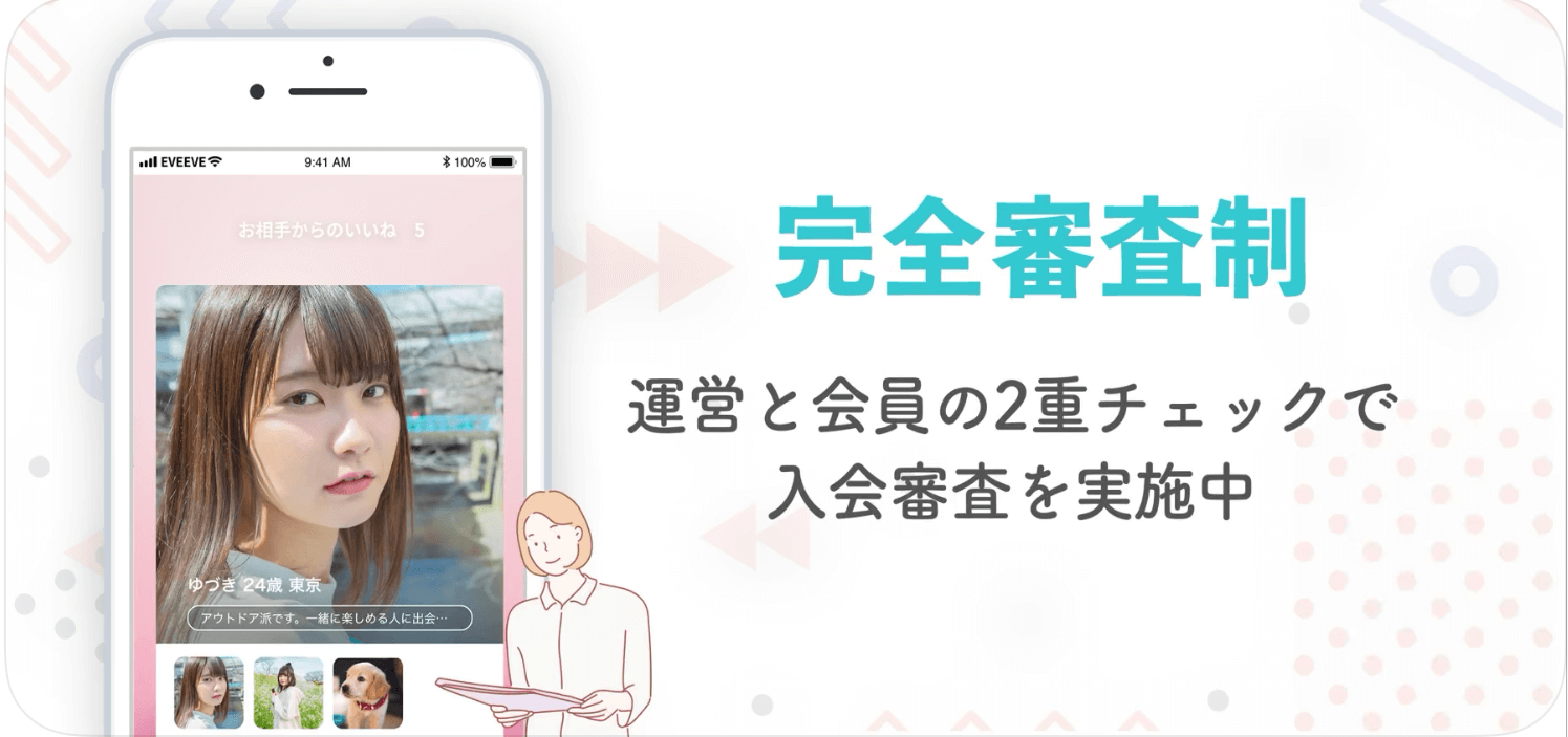 イヴイヴは完全審査制の恋活アプリ。運営と既存の会員が審査をし、認められた人だけが登録できるため安全です。