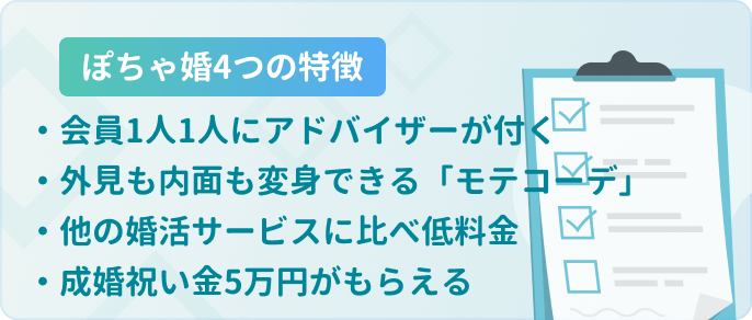 ぽちゃ婚では、会員1人1人に婚活アドバイザーが付き、親身になって婚活をバックアップしてくれます。婚活アドバイザーがしてくれることは主に以下の3つ。