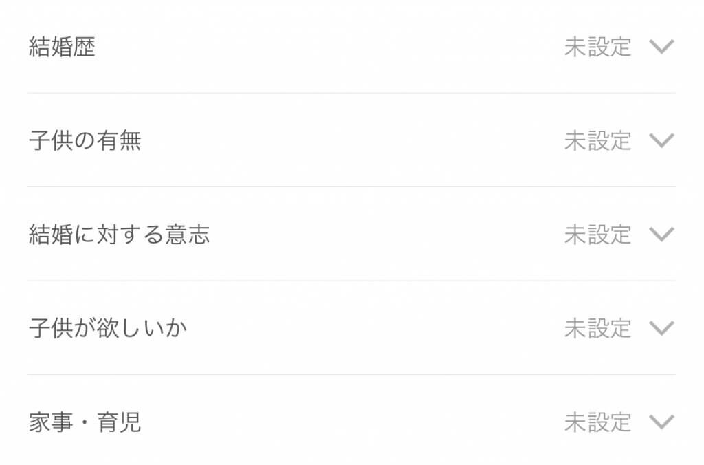 このように、アプリ内のプロフィール画面で結婚歴や子どもの有無、結婚に対する意思など「結婚」「子ども」に関わる項目が空欄の場合、既婚者である可能性があります。