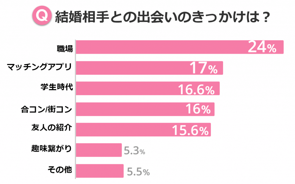今回24~39歳の既婚者男女300人を対象に結婚相手との出会いの場を調査した結果、結婚相手との出会いで一番多かったのは職場でした。