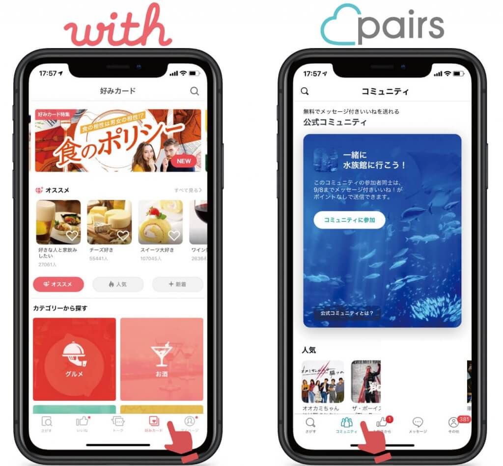 マッチングアプリでは同じ趣味趣向を持つ相手と出会えます。例えばPairsやwithには趣味趣向のコミュニティがあり、そのコミュニティに入ることで簡単に同じ趣味を持つ相手を見つけることができます。