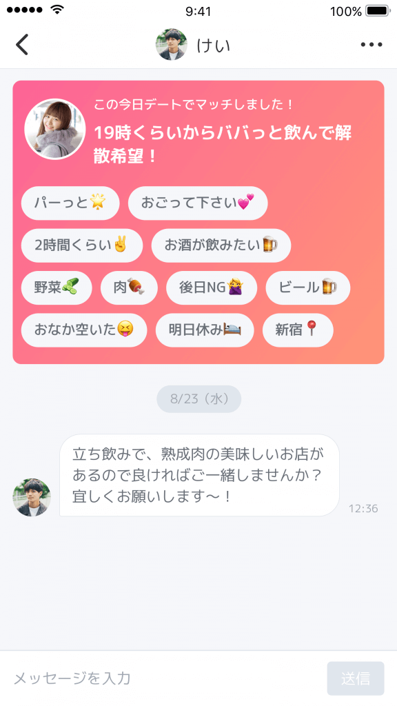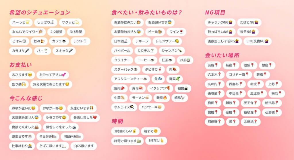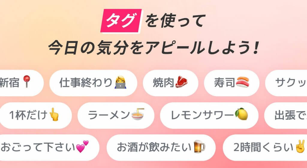 タグは相手に対して「今日どんなデートがしたいか」をアピールするツールになっています。100個以上のタグから、どんなデートをしたいかの詳細を事前に伝えることができるので、同じ目的で出会いたい人と簡単に出会うことができるのが魅力です。