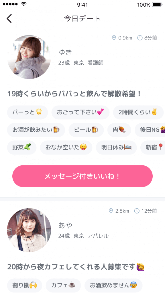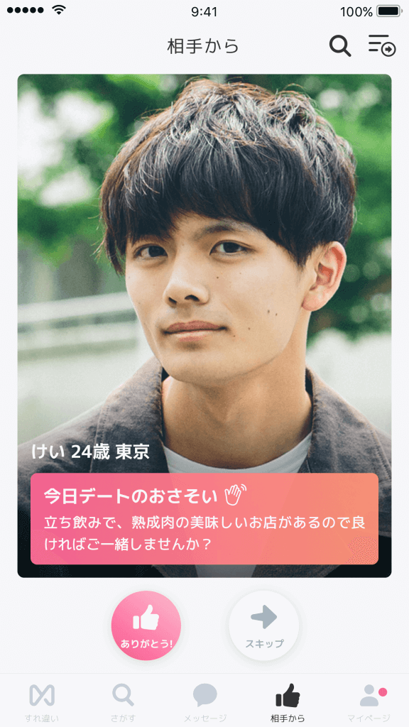 応募する側は気になる相手にアプローチをすることでいいねが返ってくるのを待つ仕組みです。相手の顔写真やタグ、距離などをみてデートに誘うかどうかを判断できるので、自分の好みの条件の相手を見つけることができます。