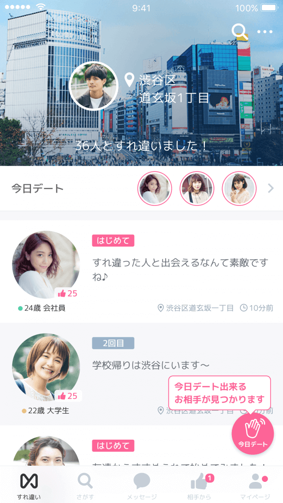 「すれ違い」機能が搭載されたマッチングアプリです。すれ違った相手とマッチングできるので、同じエリアに住む人や行動範囲が似ている人を見つけるるのが特徴です。近くにいる人とマッチできるのですぐに会うことが可能で、ユーザーの年齢層は若めです。タップル誕生をリリースしているサイバーエージェントの傘下の企業がアプリを運営しているので、安心感があります。