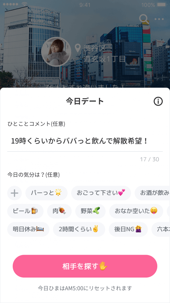 「今日デート」機能は今日ひま機能よりもさらにデートに出会うことに重きをおいた機能で、まずは会って話してみたいという方におすすめな機能ということがわかりますね。