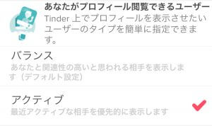 初期設定だと自分のスワイプ画面に表示されるユーザーは「アクティブ」ではなく、「バランス」に設定されています。