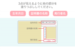 年齢確認は生年月日・証明書の名称・発行者名の3つを塗りつぶして提出することもできます。