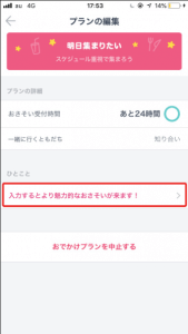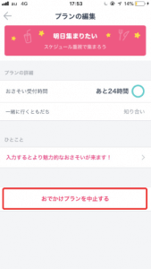 おでかけ機能は設定から24時間が経てば自動的に募集は終了するのですが、もしそれより前に終了したい場合はおでかけプランを中止するをタップすればその時点で終了になります。