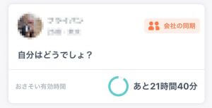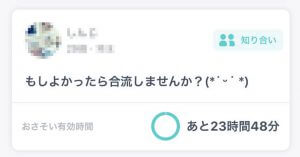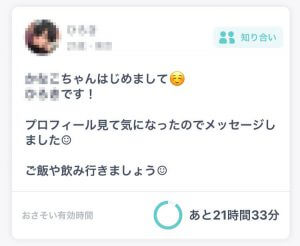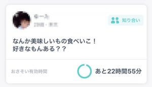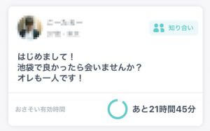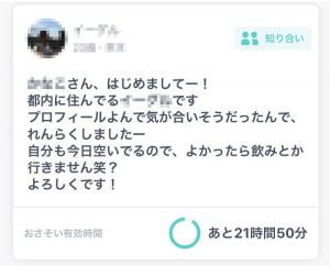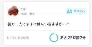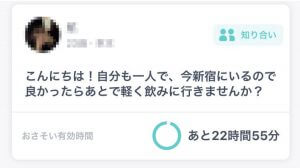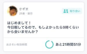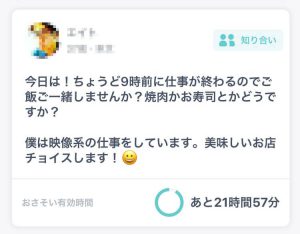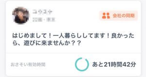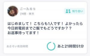 この投稿は夕方の6時くらいにしたのですが、24時間以内にきたお誘いは60件で、その内設定した9時までのお誘いは57件でした。(設定した時間をすぎるとお誘いは基本来なくなるのですが、過ぎてから3人の男性からお誘いが来ました。)