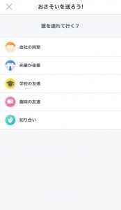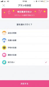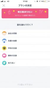 次に一緒に行く人を選ぶわけですが、もちろん1人という項目はありません。仕方ないので、ここでは適当にどれかを選びます。わたしは知り合いにしました。