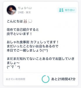 また、男性はタイムライン形式で女性からのデート募集をどんどん受け取るので、ひとことがないとスルーされてしまう可能性が。ひとことは短くていいのでなにか書くことをオススメします。