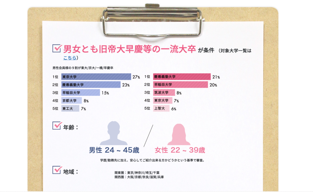 男性は東大、京大、早慶が7割以上、女性は東大、早慶が約半数という、高学歴の中でもトップクラスのユーザーが集まっています。大学名をいうと引かれてしまう女性や、高学歴女性がタイプの男性にはぴったりのサービスです!