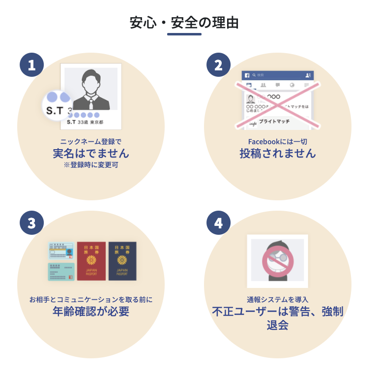 ブライトマッチでは上記のようなセキュリティ対策が取られているので、安心して利用することができます!不正ユーザーはすぐに退会させられるので、業者や要注意人物がいないのはありがたいですね。