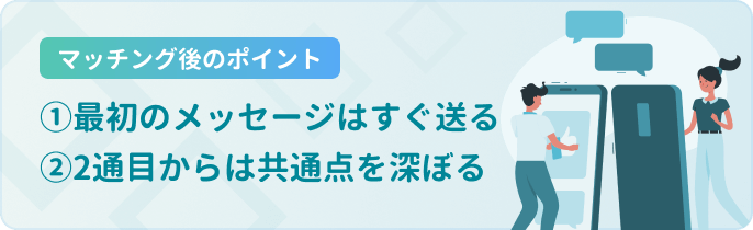 マッチングから時間が経てば経つほど返信率は低くなります。「いいねありがとう」を送ったら、なるべくすぐメッセージを送りましょう。