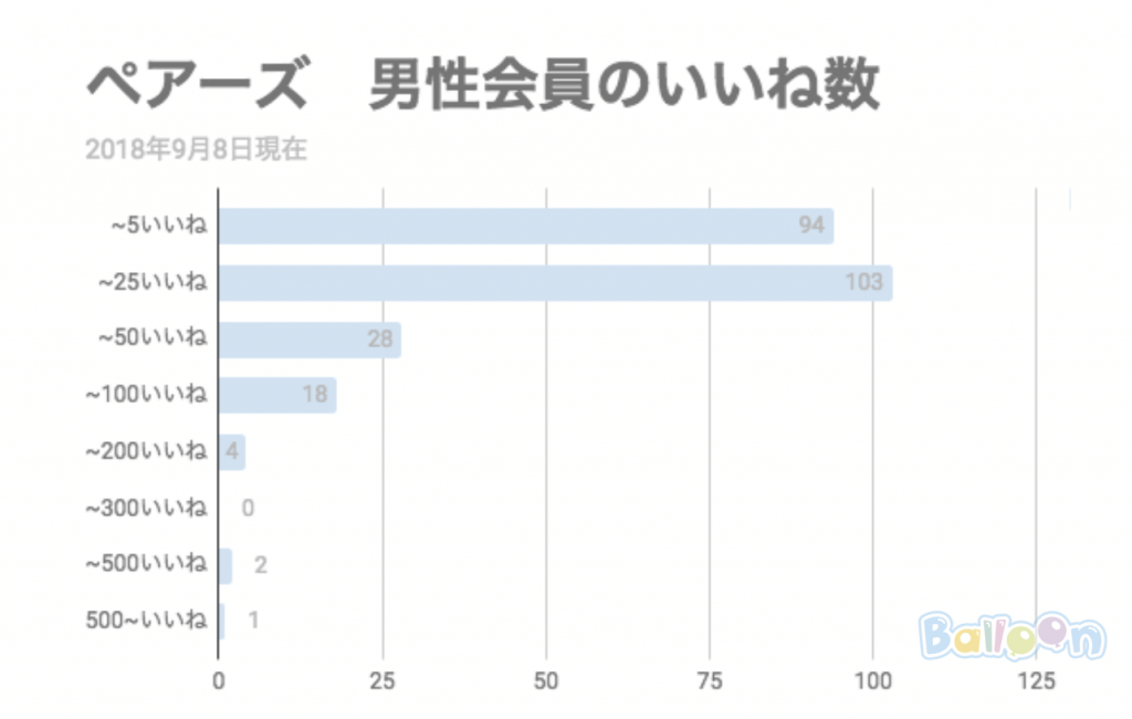 Pairs会員がどのくらいいいねをもらっているのか、balloon編集部が調査し、男女別にまとめた結果がこちらです。