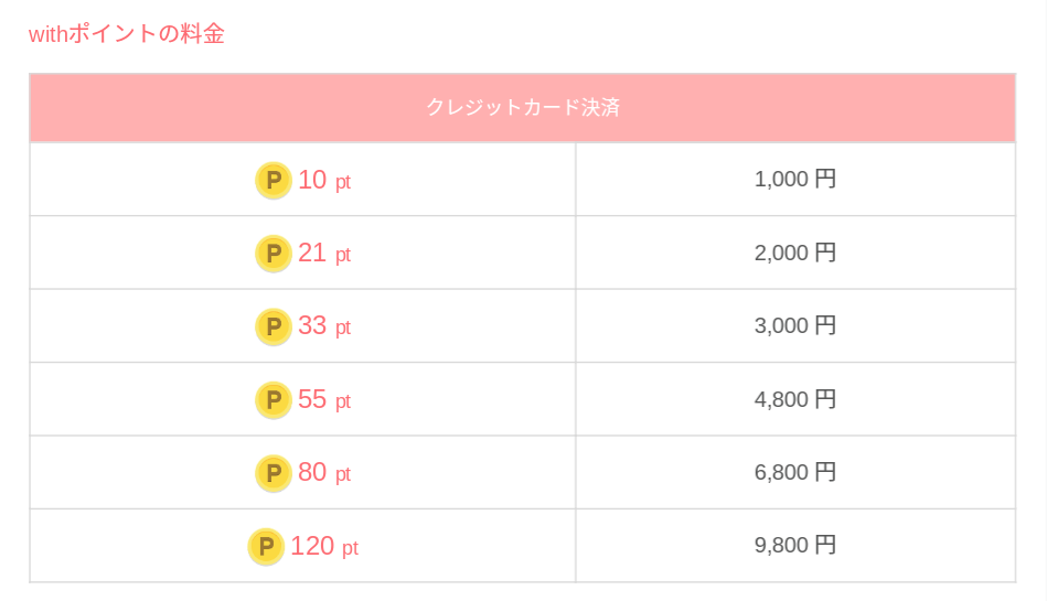こちらがWithポイントの料金表です。