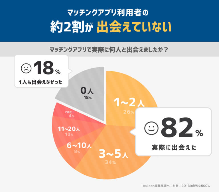 そもそもマッチングアプリは出会えるのかが気になりますが、balloon編集部でマッチングアプリ利用男女500人を調査したところ、約2割の人が1人とも出会えていないという結果に。