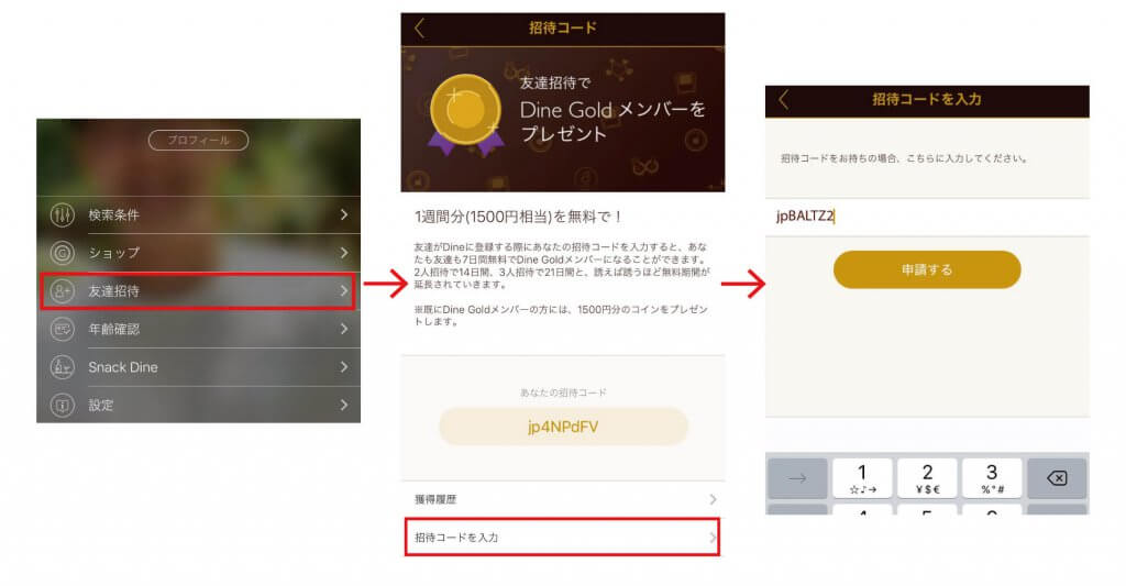 無料でゴールド会員になる方法とは、招待コードを入力して1週間分のDineGoldメンバーのプレゼントを受け取る方法です。招待コードの使い方を説明していきます。