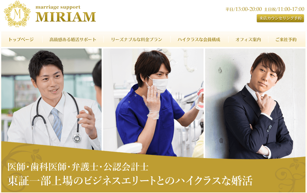 東京MIRIAMplusの特徴は、なんと言っても会員レベルの高さ。医師や弁護士、公認会計士、外資コンサルなど、花形職種からビジネスエリート層まで幅広いハイスペックが揃っています。