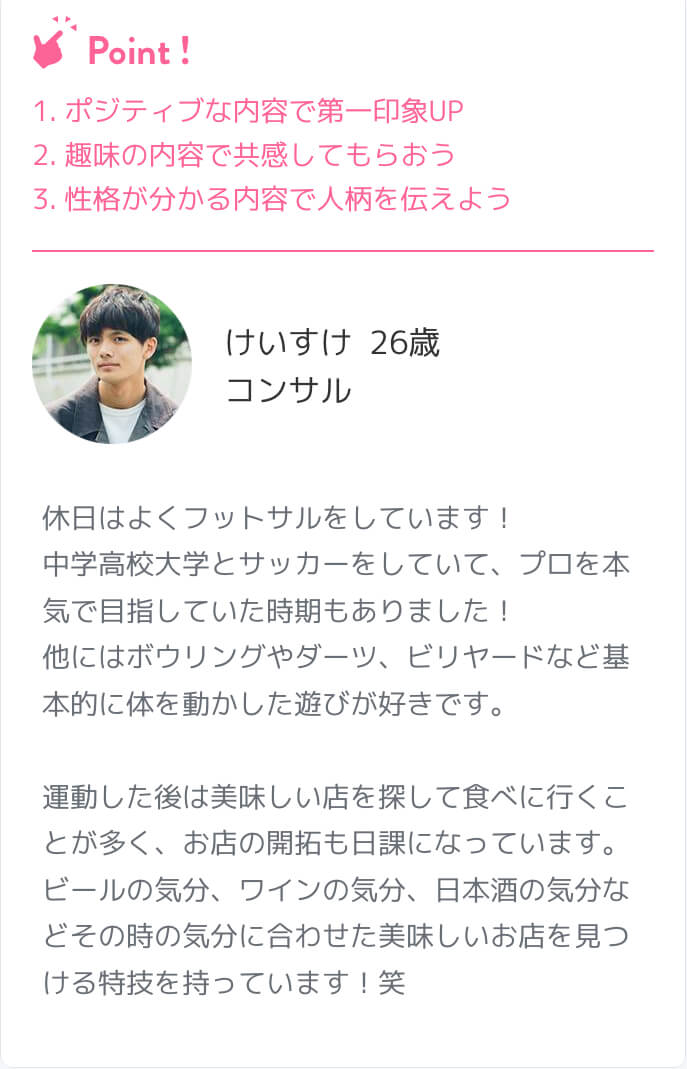 登録している趣味カテゴリの詳細に触れたり、仕事や休日の過ごし方を簡単に書けばそれだけでも充分あなたの人柄もわかるはずです。