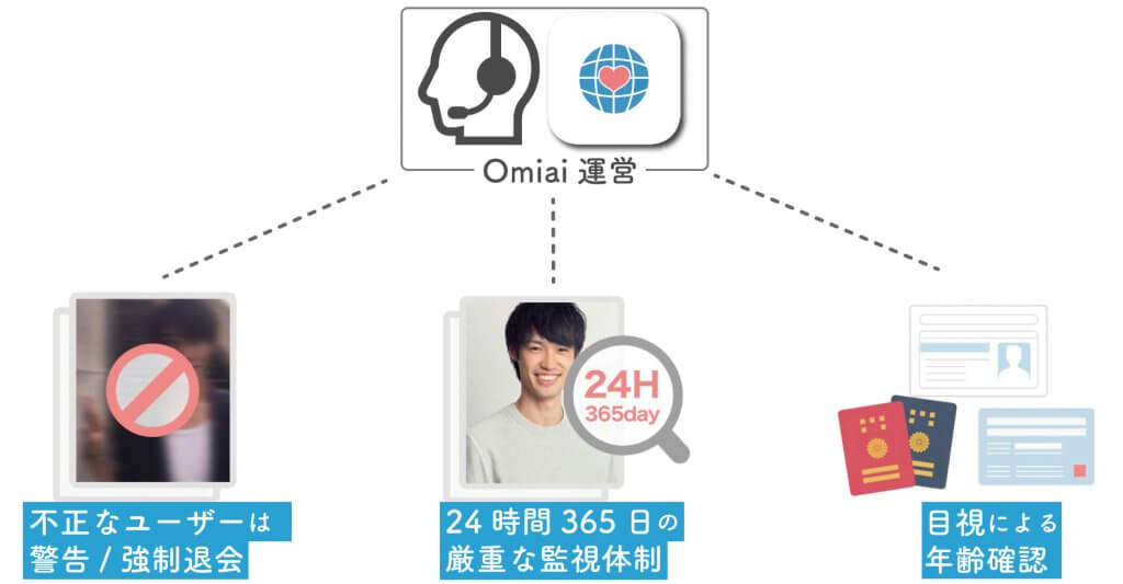 Omiaiの運営は、常に会員を監視し有人で対応しています。この厳重な監視体制により、業者だけでなく遊び目的などの真剣ではない会員も排除されるので、Omiai会員の真剣度は高くなるのです。