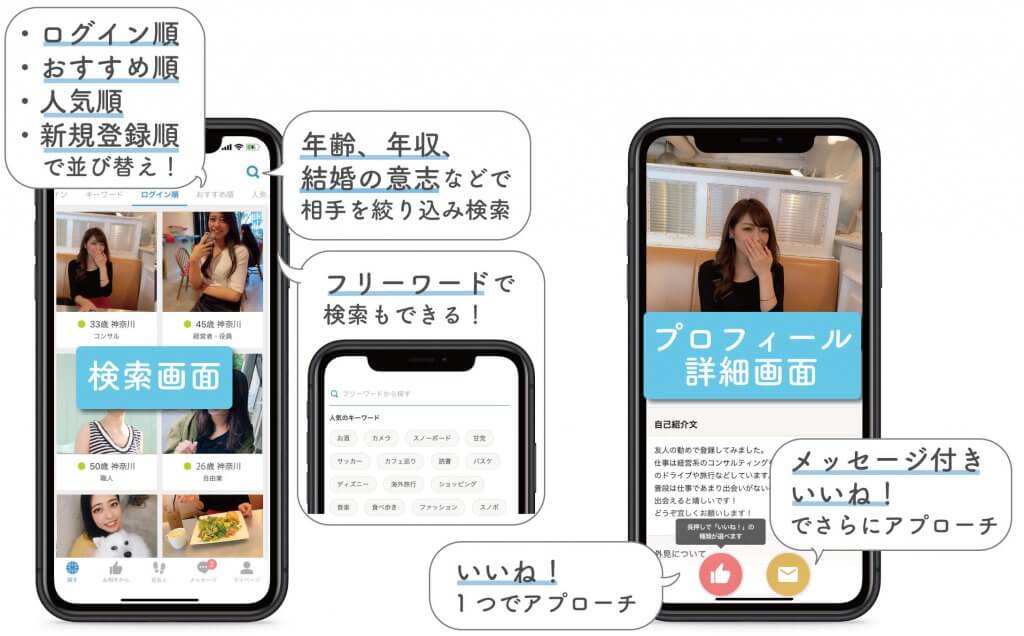 新規登録順に並び替えて登録したばかりでライバルの少ない会員を狙ったり、特に気になる相手にはメッセージ付きいいね!を送信してアプローチしたりと、使い方次第でマッチング率を上げられます。
