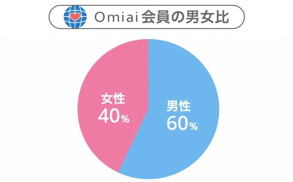 Omiai会員の男女比は6:4です。マッチングアプリは男性が多いものがほとんどですが、Omiaiはそこまで男女に差がないのでそのぶんマッチングしやすいです。